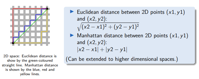 - For a discrete environment (e.g., indoor occupancy grid maps): Manhattan distance.
