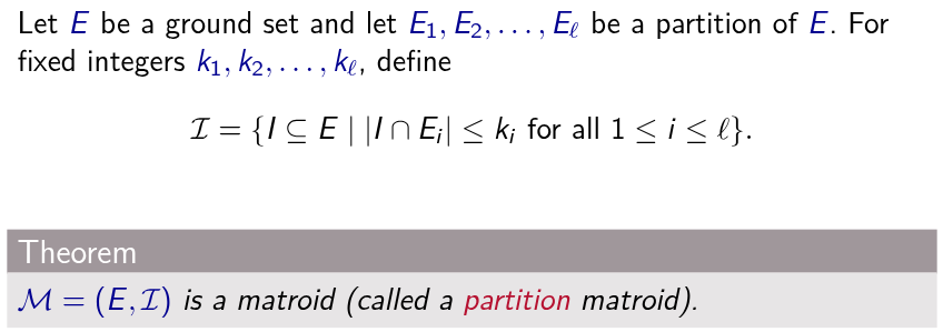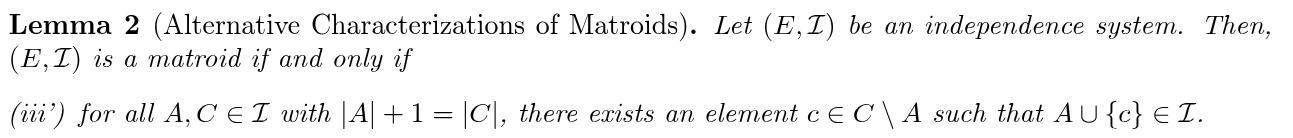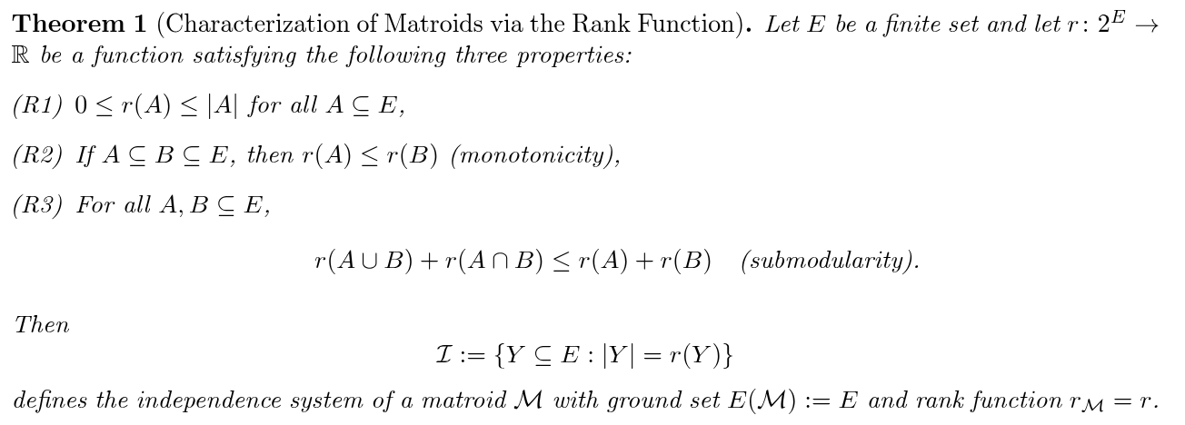 Ein greedy Algorithmus liefert eine optimale Lösung genau dann, wenn das zugrunde liegende Optimierungsproblem durch ein Matroid beschrieben werden kann.