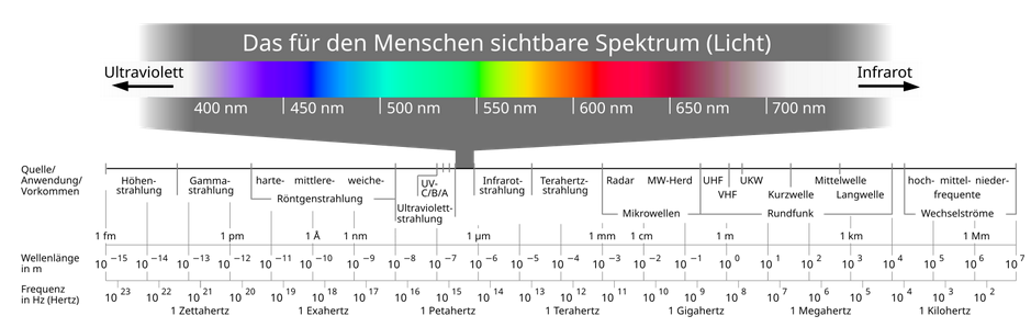 | UV | Farbe | NIR | IR | FIR | MW | KW | MW | LW | NF | |||||
