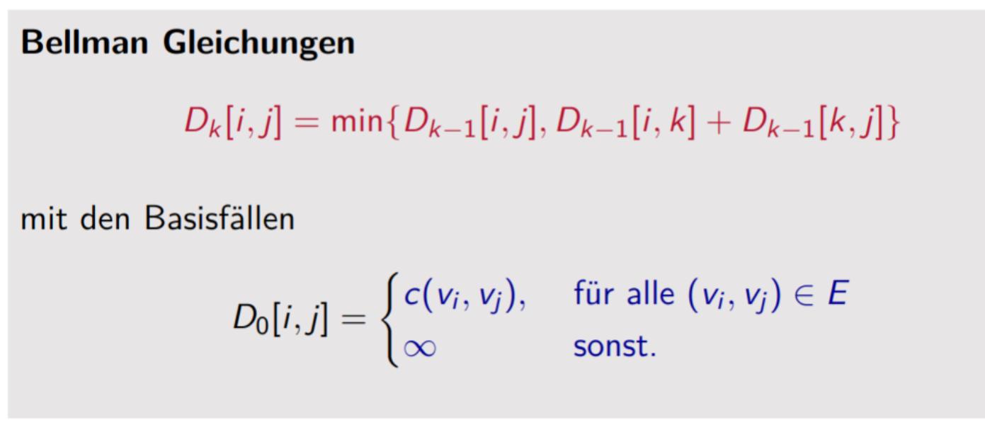 Finde kürzesten Weg zwischen Knoten u und v für alle u, v ∈ V . Wir könnten den Bellmann-Ford Algorithmus n mal anwenden (jeden Knoten v ∈ V einmal als Startknoten s): Laufzeit O(n2m). Besser: Dynamische Programmierung Beispiel alg10-DPs-2_handout-1.pdf