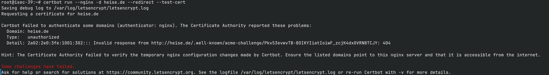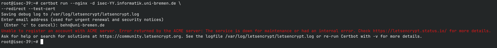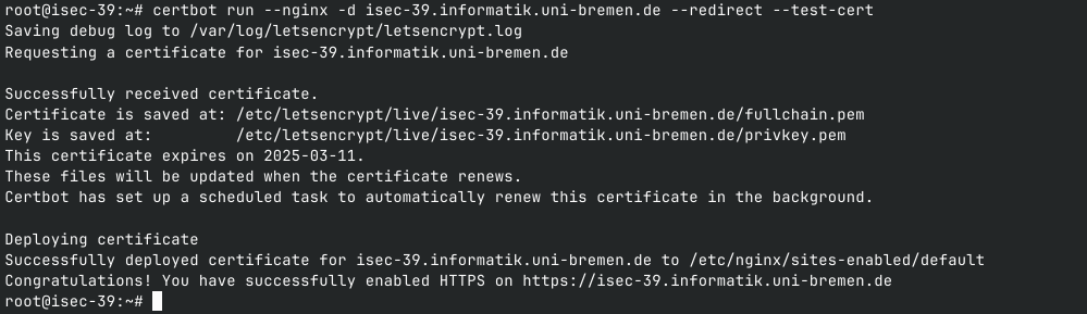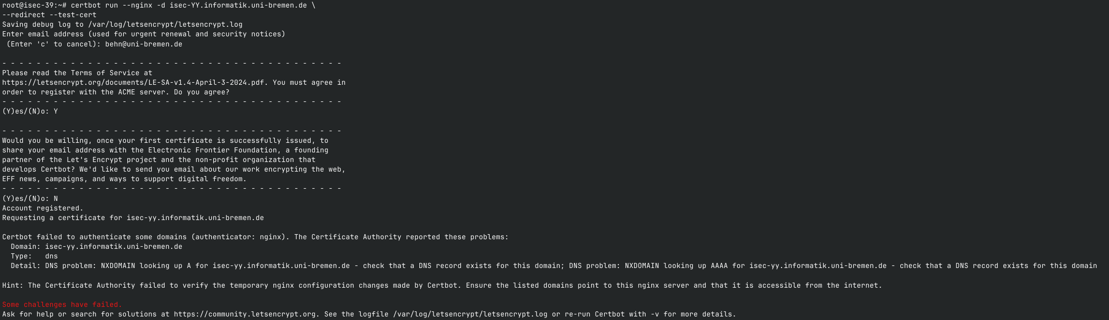 certbot run --nginx -d isec-YY.informatik.uni-bremen.de \ --redirect --test-cert