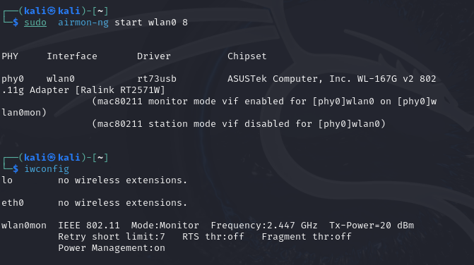 sudo airmon-ng start wlan0 8