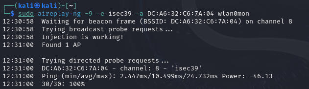 sudo aireplay-ng -9 -e isec39 -a DC:A6:32:C6:7A:04 wlan0mon