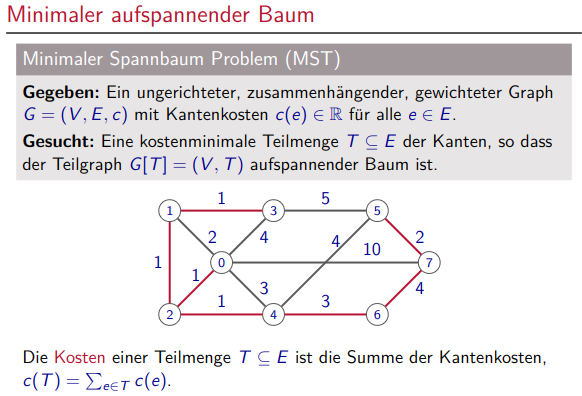 Definition Möglichkeit 1 Möglichkeit 2 s-t-Cut Möglichkeit 3 Algorithmus von Prim Algorithmus von Kruskal