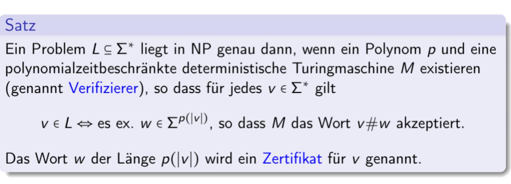 Ein Problem L liegt in NP genau dann, wenn Lösungen für L in Polynomialzeit verifiziert werden können.