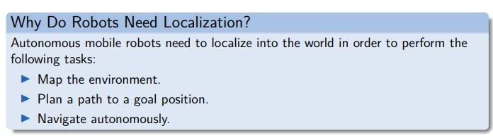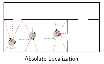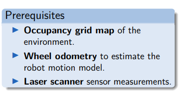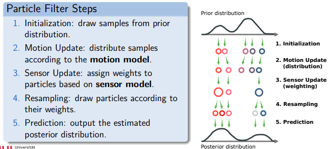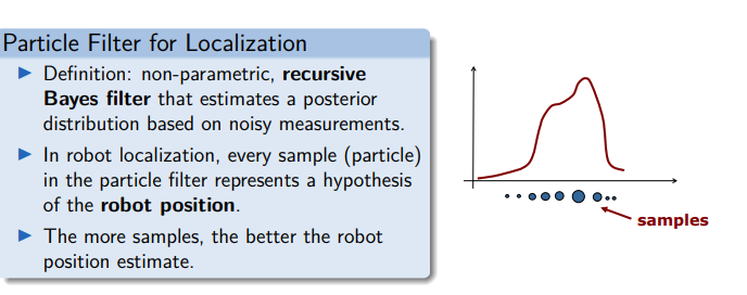 Methods: Kalman filter, particle filter (Monte Carlo Localization).