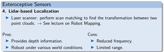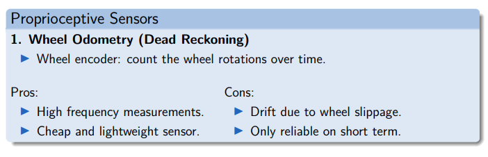 Sensors measurements: wheel encoder, IMU, GPS, laser scanner, camera, etc.Pros: