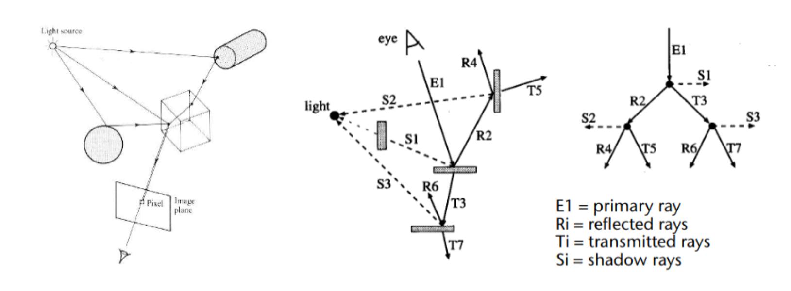 Basic idea of ray-tracing: construct ray paths from the light sources to the eye, but follow those paths “backwards”