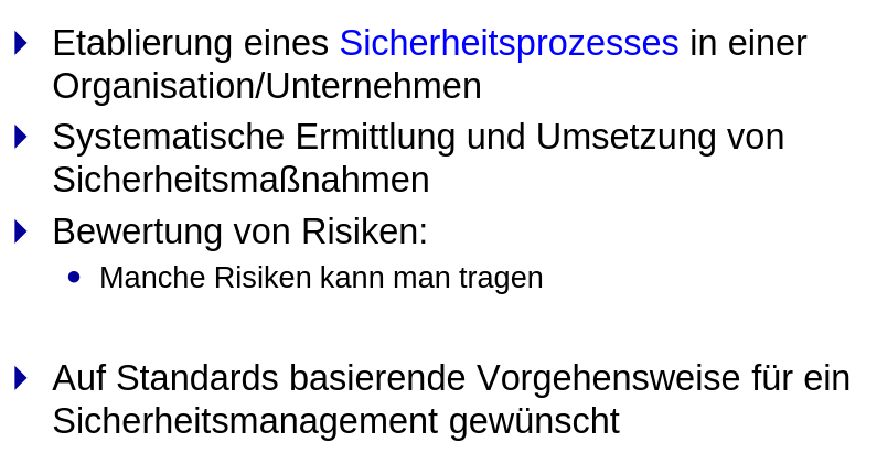 British Standard 7799 BSI-Grundschutzkompendium Infrastrukturanalyse Schutzbedarfsfeststellung Basis-Sicherheitscheck Grundschutz-Zertifizierung