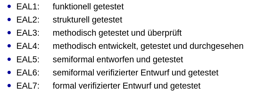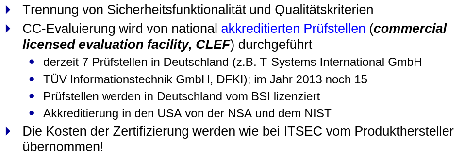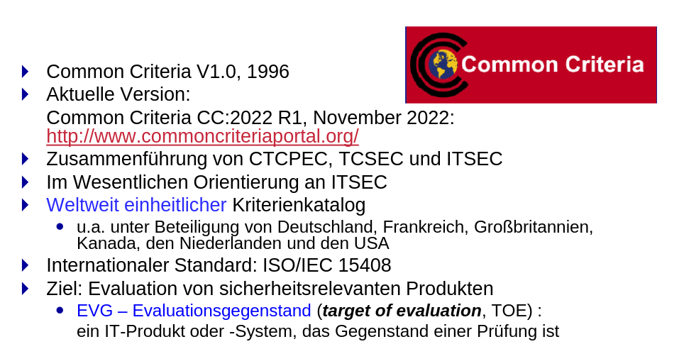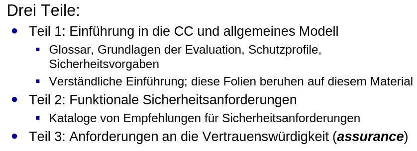 Weiterentwicklung von ITSEC Vorteile Probleme Struktur der CC-Dokumente Teil 2 Teil 3 Vertrauenswürdigkeitsstufen Schutzprofil Sicherheitsvorgaben Beispiel