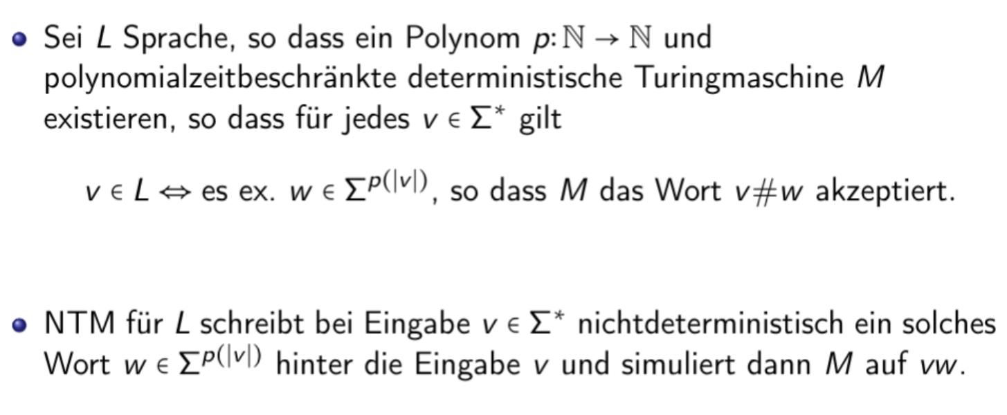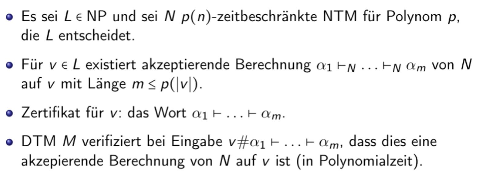 Ein Problem L liegt in NP genau dann, wenn Lösungen für L in Polynomialzeit verifiziert werden können.