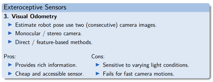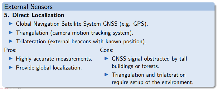Sensors measurements: wheel encoder, IMU, GPS, laser scanner, camera, etc.Pros: