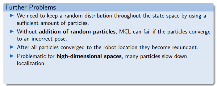 Methods: Kalman filter, particle filter (Monte Carlo Localization).