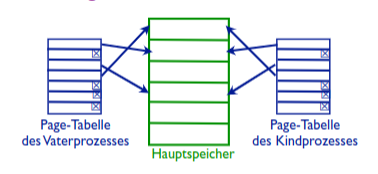 ⇒ Copy-on-write (Page Fault ⇒ Betriebssystem kopiert)