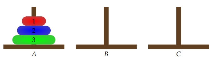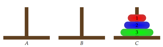 Das folgende Spiel wurde 1883 von Édouard Lucas erfunden. Gegeben sind drei Stäbe ( zum stapeln und eine Anzahl von gelochte Scheiben, die zu Beginn alle auf dem Stab A gelegt sind.